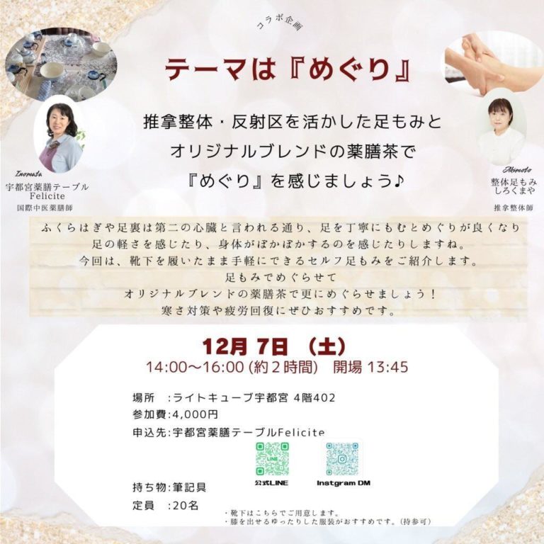 2024年12月7 日(土)コラボ企画:「めぐり」~足もみ(推拿整体)と薬膳茶で巡らせましょう