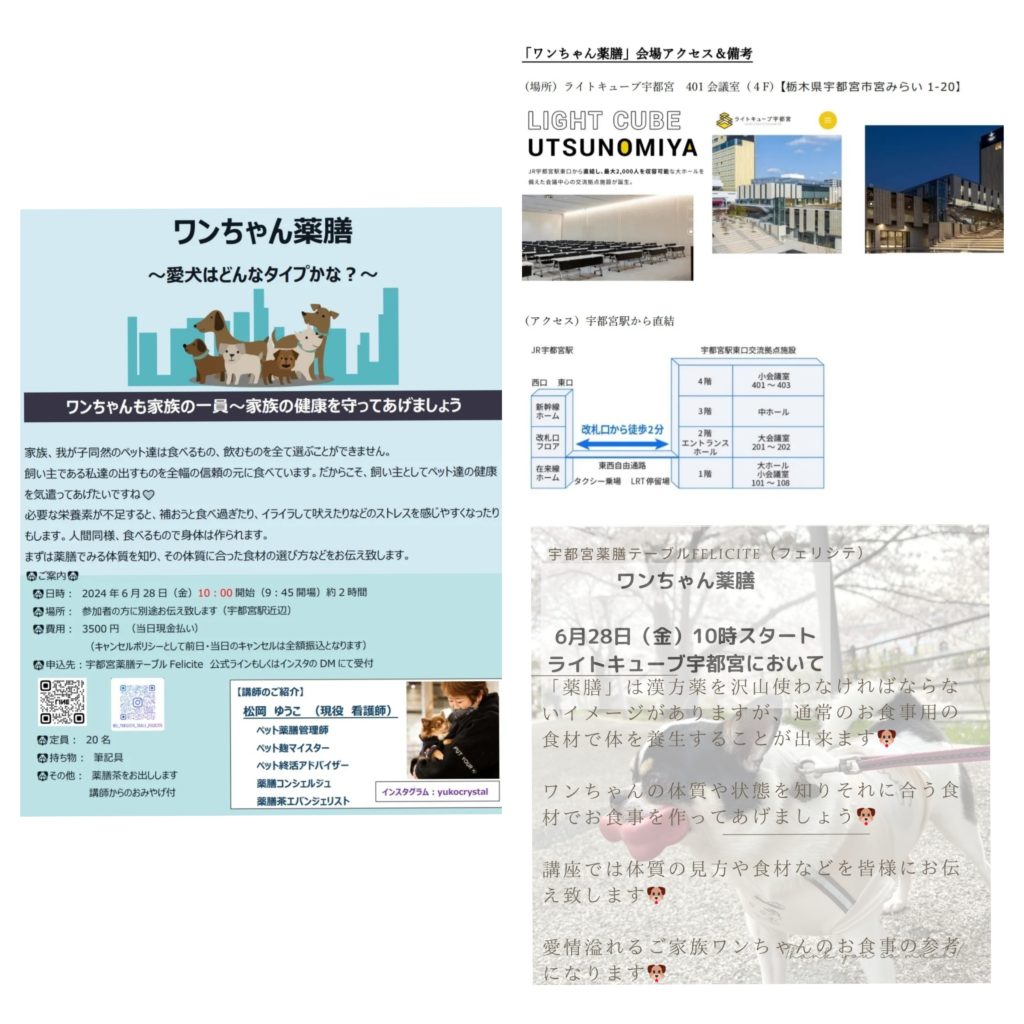 2024 6月28日ワンちゃん薬膳開催申込受付中~こちらの「Contact」からどうぞ~場所は「ライトキューブ宇都宮」